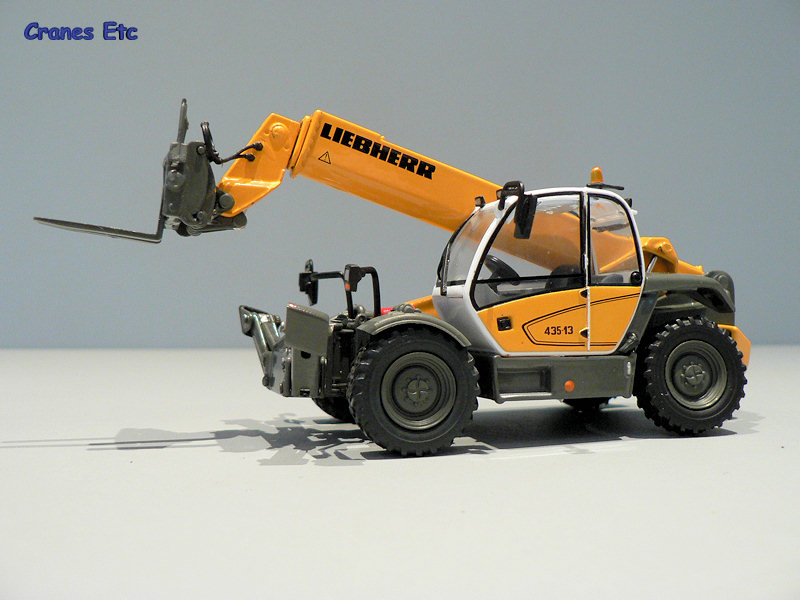 | The Liebherr TL 435-13 Telehandler has a maximum lift height of 13m and a maximum lifting capacity of 3.5 tonnes which is obtained when the front stabilisers are used. It is an all wheel drive machine with all axles steerable. When travelling on roads, generally only the front axle is used for steering and the maximum speed is around 25 km/h (15mph).