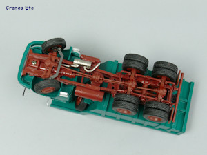 Underneath, the chassis is modelled in detail with a nice exhaust system. The transmission elements are in plastic, and the steering is functionally modelled. The wheels have a detailed design with all tyres of the same design.