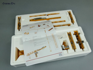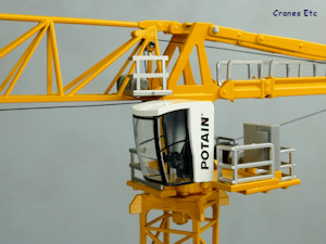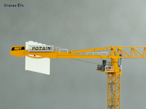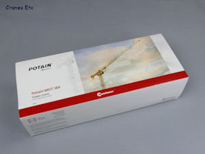 | Potain branded box. |  |  | Metal blocks stabilise the bottom of the tower. |  | Nicely detailed cab. |  | The Potain MDT look. |  | Excellent straight geometry. |  | Realistic profile. |  | The triangular jib has no bottom face. |  | Looking up. Ladders in the tower. |
