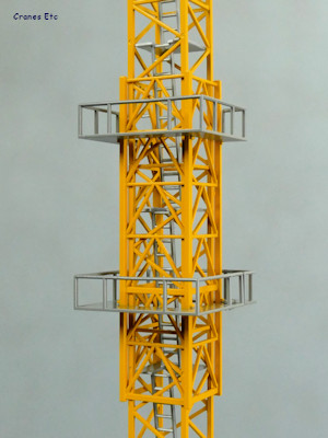 The mast sections are made up as pairs of two sections on the real crane, so it is not possible to pose the model simulating climbing. Plastic ladder sections and platforms are included. The mast sections join together using small longitudinal pins. It works well enough, but the tower can be knocked out of line. On the review model some cleaning around the pins enabled the best true fit of adjacent sections to produce a straight tower.