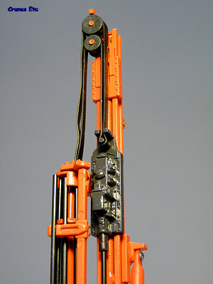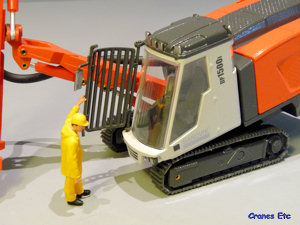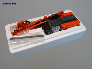 The boom is a very good piece of modelling. The hydraulic cylinders have plastic jackets and there are other plastic parts but the colour match to the rest of the model is excellent so the plastic parts do not detract from the look of the model at all. Metal drill rods are provided and perhaps the only detail missing is a drill head to fit on the end of the drill rod. The look of the model is also enhanced by the rubber hosing.