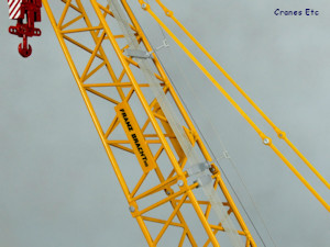 Full assembly of the complete crane takes several hours. One issue to be careful of is to not fully load the suspended ballast tray if there is no load on the hook as this can pull the back mast down causing the A-frame luffing ropes to jump off their pulleys.