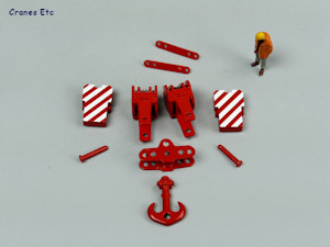 All of the pulleys are high quality metal, and are free rolling. The pendant bars are plastic and pin together maintaining a true line when under load, and they certainly seem strong and robust. However the colour match with the metal parts is a little variable and they do not represent the detail of the real crane pendants.