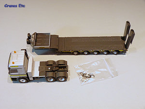 |  | The parts out of the box. |  | The tractor unit. |  | Underneath view. |  | Some good detailing underneath, and very good steering. The plastic pin forward of the first axle can be removed to separate the gooseneck from the trailer. |  | Rear view. |  | Loading an ABI MobilRam TM 12/15. |  | The ABI loaded. |