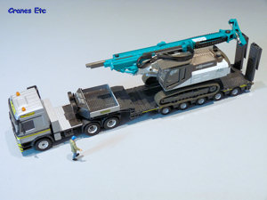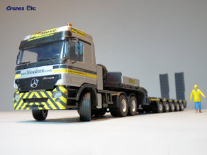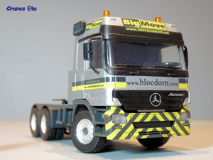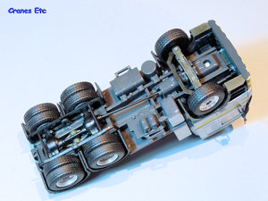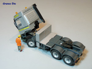 The tractor unit is a three axle Mercedes-Benz 6x4 Actros. Underneath, the transmission components are well detailed albeit in plastic, and the tyres are mounted on good hubs although the tyre tread pattern is the same on all wheels rather than different on the steering axle. The cab is reasonably well detailed with the usual items such as door mirrors, windscreen wipers and orange beacon lights.