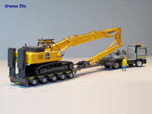 | The Conrad brand box. |  |  | Tilting cab, although tilt range is limited. |  | Tractor and trailer. |  | The trailer can be supported by legs front and rear when disconnected from the tractor. |  | The trailer extended and shown here with the deck posts fitted. |  | Carrying a Komatsu Demolition Excavator with the trailer extended. |