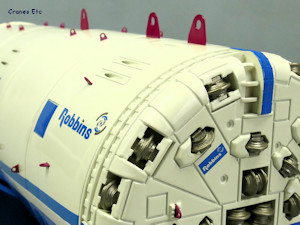 The TBM load is mainly a precision plastic part. The cutter head is particularly nice, with the discs modelled realistically. However the four central cutting discs appear to be set in the wrong direction, against the rotation of the head. At the rear a segment erector and pusher hydraulic rams are simply modelled. Small red securing tabs are fitted to the outside. They are delicate and should not be loaded.