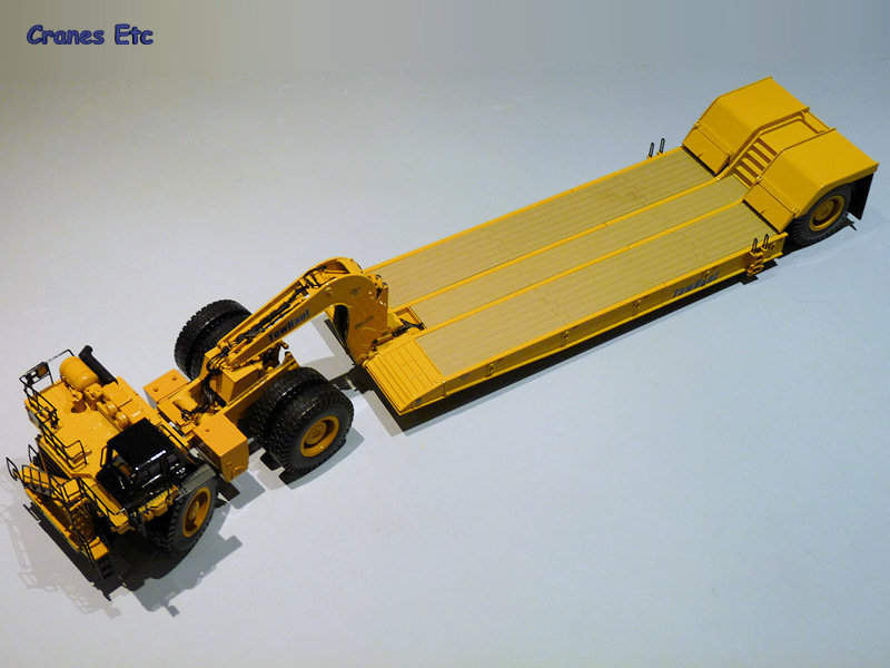 | CAT style box, but supersize. |  |  | Heavy haulage on a grand scale. |  | Very good metal hand railing and other details on the cab deck. |  | Underside of the trailer shows good structure. |  | The gooseneck. Tiny nameplates on the gooseneck and trailer. |  | Opening flaps provide access to the rear axles. |  | Carrying a Bucyrus 49HR Blasthole Drill. |