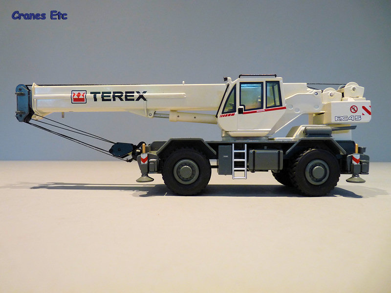 | Terex picture box. |  |  | The parts out of the box, including two keys for operating the winches and plenty of pins. |  | Excellent metal hubs on the wheels, and good lock on the steering. |  | Set up and ready to lift. The lifting chains shown are not supplied with the model. |  | The outriggers can hold the crane off the ground. |  | Lifting a lightweight beam. |  | The boom is not quite fully extended in this photo. |