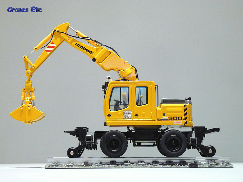 | Liebherr branded box. |  |  | The various parts. |  | Plenty of lights for working on the rails at night. |  | Articulated boom allows offset digging. |  | Graphics on the body are excellent. |  | Fitting the grab. |  | Travelling on the road. |  | Loaded on a Nooteboom low loader. |