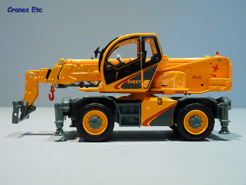 The carrier detail is reasonable with textured stepping surfaces and the outrigger beams and pads are metal. The outrigger pistons are visible screw threads.