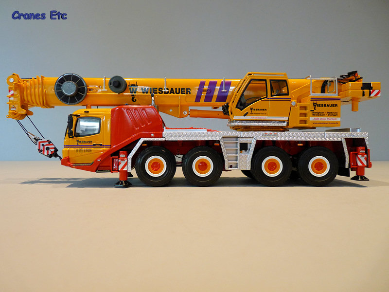 |  | The model inside the expanded polystyrene tray. |  | It looks very sharp in Wiesbauer livery. |  | Outriggers display a realistic looking piston. |  | More great detailing around the cab. |  | The crane can sit high on the outriggers. |  | The optional second winch attached |  | Fly jib is very good. |  | Fly jib attached and posed at an offset. |  | Short jib extension. Pins attaching the fly jib are a bit too long. |