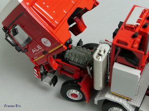 Under the cab is a detailed engine bearing the Mercedes-Benz name.