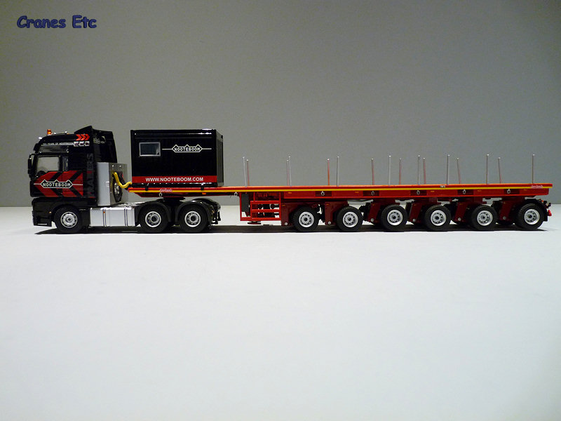 | The Nooteboom box. |  |  | The parts out of the box including brochure and certificate of authenticity. |  | Profile view of the MAN. |  | Underside view - high detail. |  | A spare wheel can be removed from its holder on the trailer. |  | The container. |  | Loaded with ballast, the OVB-102-06 fulfills its purpose. |  | Detail underneath is excellent. Here the steering axles (right to left, 1, 3-6) are set to maximum lock. |  | Independent suspension on each axle allows plenty of movement over rough terrain. |  | The Nooteboom Ballast Trailer supports a Liebherr LTM1300 to take down a Liebherr 630 EC-H Tower Crane. |