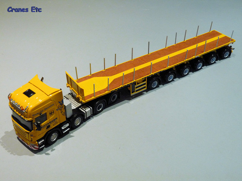 | The box. |  |  | Very smart paint job on the Scania R580. |  | Tilting cab. A photo of a Kavanagh depot is printed on the back. |  | Underside of the tractor with the steering shown as far as it will go |  | Underside of the trailer. |  | The spare wheel goes in its own holder. |  | Excellent steering on the trailer. |  | The ballast carrier paired up with a Terex AC100/4 in Kavanagh colours. |