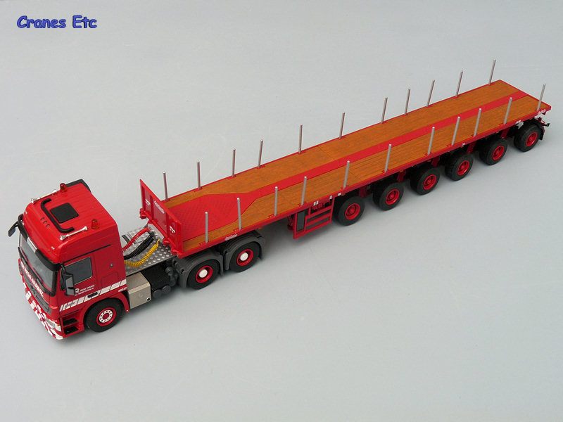 | The box. |  |  | The MB Actros tractor looks great. Decent movement in the steering mechanism. |  | The fifth wheel is fixed in position. |  | Tilting cab. |  | Super single tyres look good. They are too wide to carry as a spare in the holder. |  | Axle one raised out of service. |  | Carrying counterweight and jib parts. |