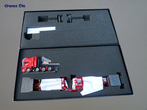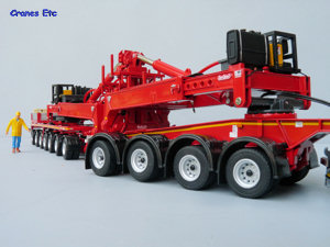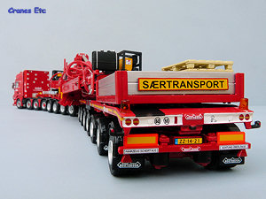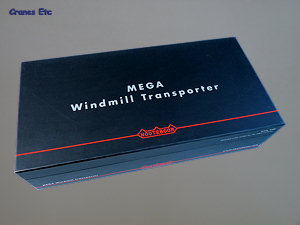 | The Nooteboom box. |  |  | The parts out of the box. |  | Windmill on the equipment tower. |  | Great detail underneath. |  | The 4-axle jeep dolly. The steering on the rear two axles is shown at the maximum lock. |  | The two dollys coupled for transport. |  | Generator on the rear dolly. |  | Details at the rear. |  | The extendible bed slightly lengthened to carry two sections. |  | Legs can hold the jeep dolly when the tractor is disconnected. |  | Impressive. |