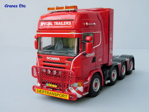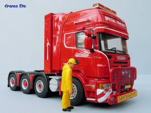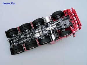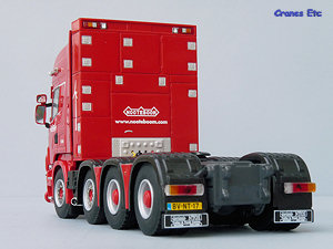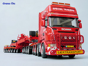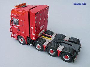 The tractor unit is a Scania R Topline 8x4 unit. Details underneath are of the usual WSI high quality with the main elements of the transmission and suspension modelled. Appropriate tyres are mounted on the steering and non-steering wheels, and the hubs are excellent. The front has a bull bar which has a fine mesh and looks great. There is a number plate and a 'special transport' sign. The colour coded mirrors look smart as does the beacon light bar on the roof. Inside the cab, the two beds are modelled behind the seats. Air lines to the trailer extend from the equipment tower behind the cab and diamond plated surfaces surround the fifth wheel. As with other tractors in Nooteboom colours it has a unique number which for this model is T-016.