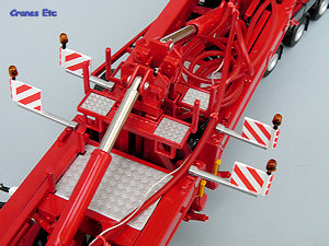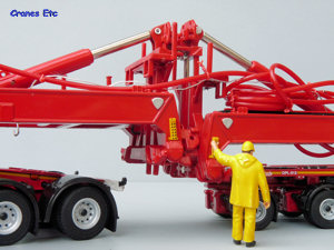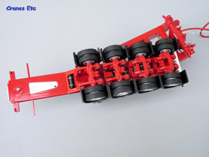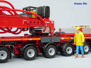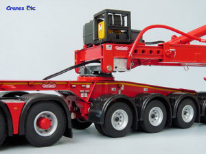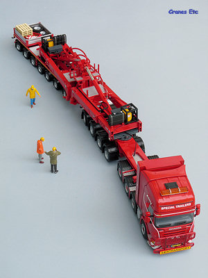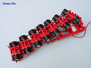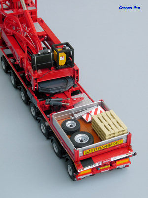The self-steering dolly is a seven axle unit and it replicates all the high quality detailing of the jeepdolly with the addition of a special transport sign at the rear. At the rear a storage platform has been added and this has a couple of spare wheels. A red control cable links the two dollies. The unique number for the rear dolly is OPL-012.